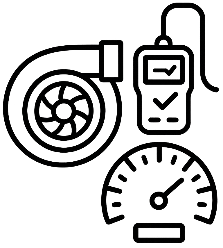 We drive it under load, pull active and stored codes, and watch boost, MAP, EBP, and temps. Spool time, smoke, and noises tell us where to dig.